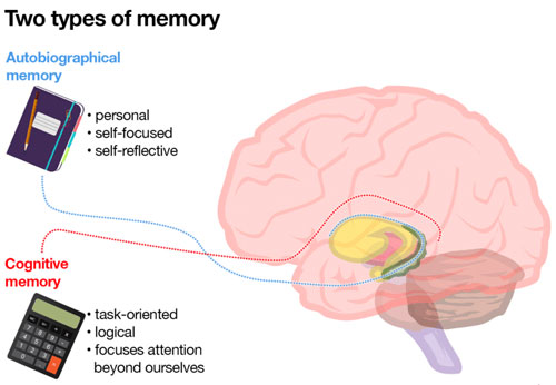 Conversely, the autobiographic memory network is suppressed when the cognitive control network is required to gather the attention needed for a task at hand. This is in line with the notion that we “lose ourselves” when we are absorbed doing something.