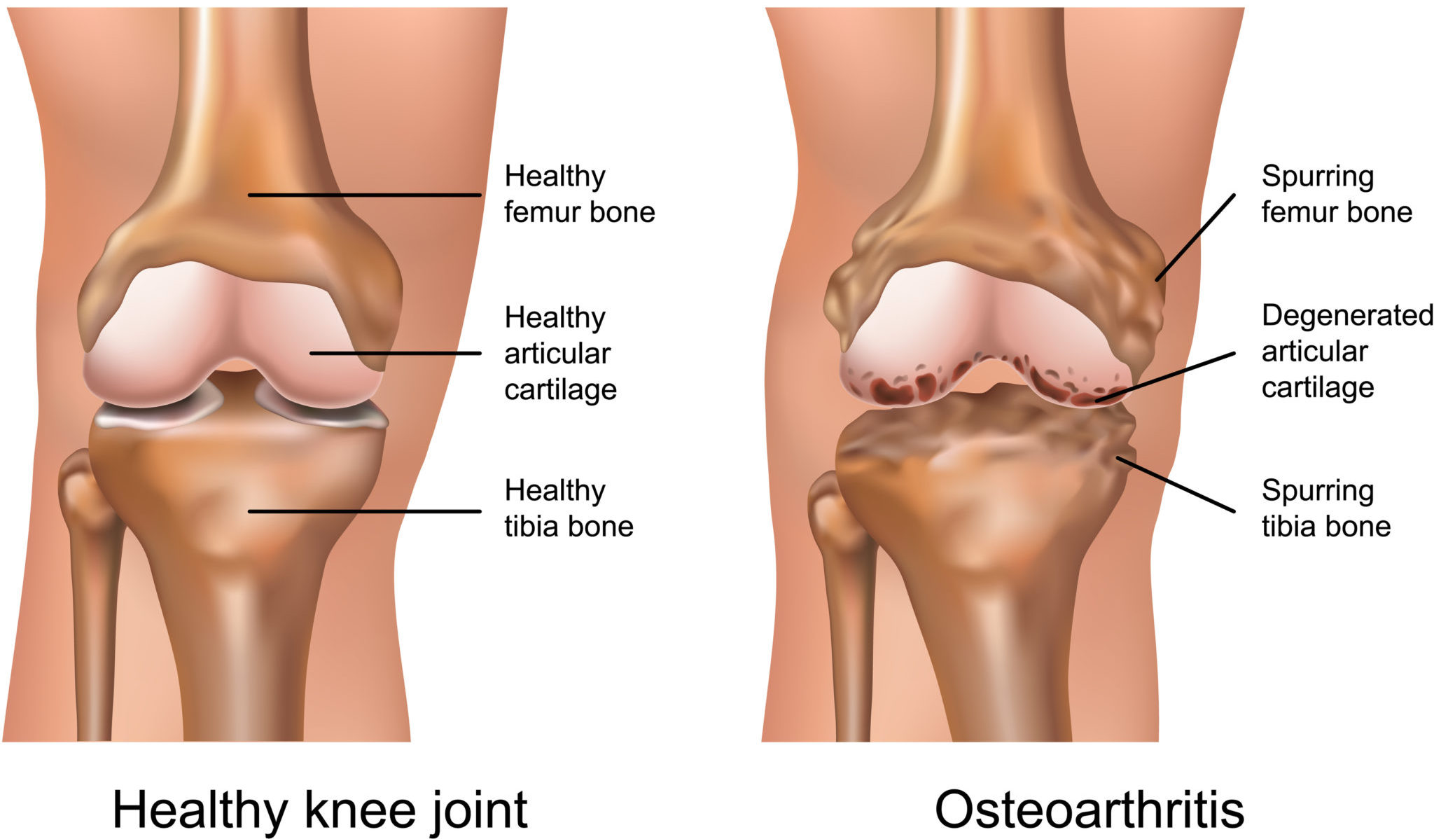 Osteoarthritis occurs when the protective cartilage that cushions the ends of your bones wears down over time. Although osteoarthritis can damage any joint, the knee joint is most frequently affected, followed by the hip and hand.