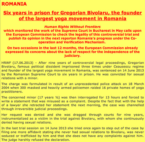 Here is a letter coming from the most important human rights organization on freedom of religion and belief, Human Rights Without Frontiers. This letter comes as a reaction to the 14th of June 2013 sentence of Mr Gregorian Bivolaru at the Supreme Court of Justice in Romania. Being in their attention for a while, Mr Bivolaru’s case raised several doubts about the judicial system of a Romania that is still under the influence of the same groups of power.