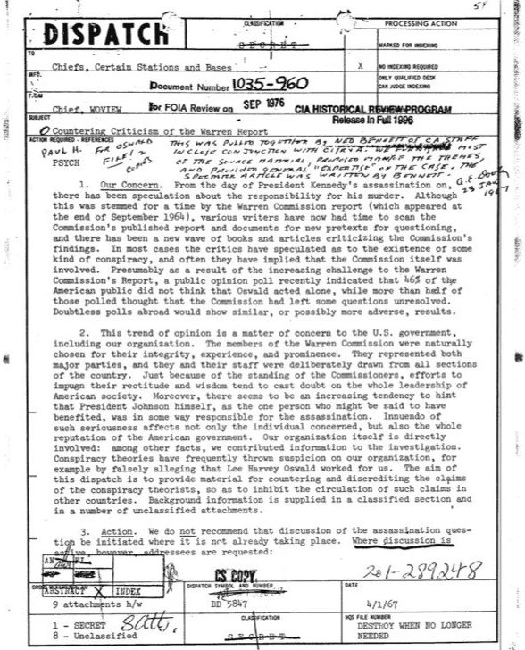 The CIA dispatch only became public in 1976 following a Freedom of Information Act request by the New York Times. On the dispatch were marked “PSYCH” (for psychological warfare) and “destroy when no longer needed.” The subject line read: “Countering Criticism of the Warren Report.”