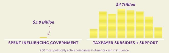 Recent studies have shown that public opinion has almost no effect on the political process. What does have an effect is money. Over a five-year period 200 companies spent $5.8 billion on lobbying and campaign contributions to influence legislation. In return they netted $4 trillion in subsidies and support: