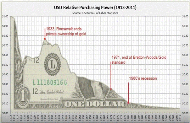 Remember that the purpose of the Federal Reserve Act was to provide a safer, more flexible, and more stable monetary and financial system. The Constitution also empowered Congress to regulate the value of the money it was empowered to create. The graph below illustrates the decline in the value of the dollar’s purchasing power from 1913 to 2011: