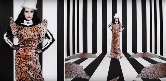 Bea stands inside a room with dualistic black and white stripes – an important part of MK programming. She wears a leopard-print dress which is associated Sex Kitten programming and used to identify Beta slaves.
