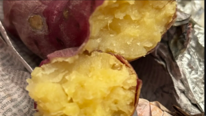 Japanese people are crazy about baked sweet potatoes, called “yaki imo.” I bake a medium-sized sweet potato in the oven for about 60 minutes at 425 degrees Fahrenheit (220 degrees Celsius).