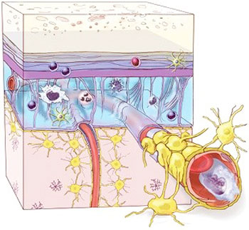 Dorian McGavern, an immunologist at the National Institute of Neurological Disorders and Stroke in Bethesda, Maryland, wanted to gain a better understanding about how different immune cells contribute to injury repair so he started tracking CNS injury responses in real time. With the help of two-photon microscopy to image cells below the surface of brain tissue in living animals, with his colleagues, he was able to see that just minutes after injury, microglia clear up debris in the parenchyma. “They’ll look around the environment, and basically start street-sweeping and picking up all the dead material,” McGavern says. Meanwhile, other immune cells remain confined to the meninges and to the so-called perivascular spaces between larger cerebral blood vessels and their sheaths of pia mater, the innermost meningeal membrane.