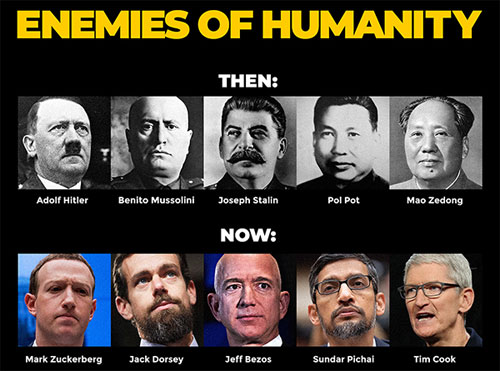 It’s irrefutable that their flagrant censorship and brazen actions to “host the enemy” have posed very real threats to the American people. With this critical understanding, it’s of paramount importance to comprehend just how dangerous Bezos, Zuckerberg, Dorsey, Cook and Pichai truly are. These criminally insane psychopaths are potentially much worse that their XX century counterparts pictured above!