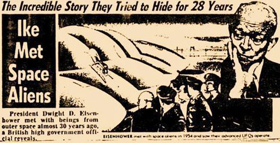 “The preceding diplomatic treaty was drafted by the directorate of the Majestic-12 operation and a joint committee of extra-terrestrial visitors and representatives of the U.S. Diplomatic Corps, as a statement of intent. It was ratified and signed at Kirtland Air Force Base, Texas on July the eighteenth, 1954 by President Dwight D. Eisenhower and an individual on the behalf of the EBE’s.ˮ
