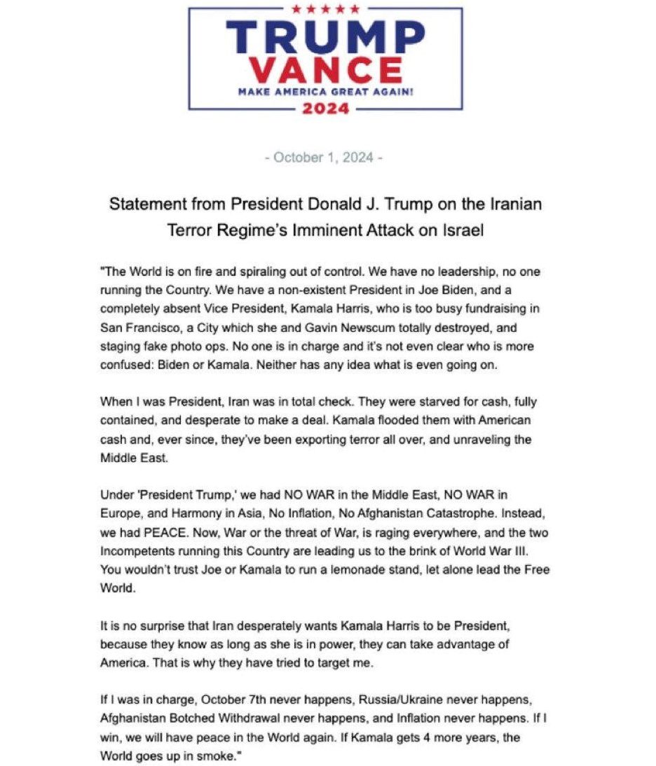 If I was in charge, October 7th never happens, Russia/Ukraine never happens, Afghanistan Botched Withdrawal never happens, and Inflation never happens. If I am in, we will have peace in the World again. If Kamala gets 4 more years, the World goes up in smoke.”
