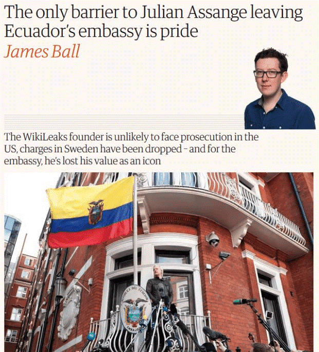 Two years later, The Guardian was still peddling the same line that, despite the UK spending many millions ringing the embassy with police officers to prevent Assange from “fleeing justice”, it was only “pride” that kept him detained in the embassy.