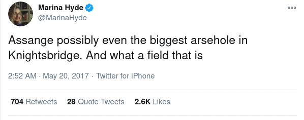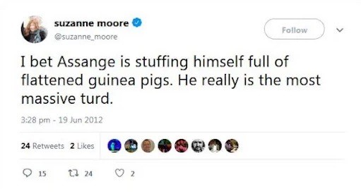 Anyone who didn’t understand quite how personally hostile so many Guardian writers were to Assange needs to examine their tweets, where they felt freer to take the gloves off. Hyde described him as “possibly even the biggest arsehole in Knightsbridge” while Suzanne Moore said he was “the most massive turd.”