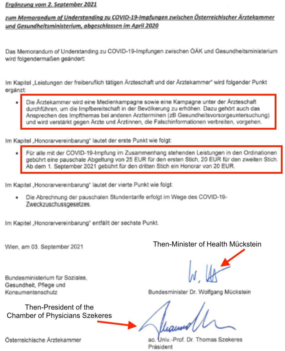 That was not all: in an Amendments (dated 2 Sept. 2021) to the Memorandum of Understanding on Covid-19 Vaccinations between the Austrian Chamber of Physicians and the Ministry of Health, concluded in April 2020, the medical association leadership “promised action with respect to the services rendered by the medical profession”. These, too, signed off by both parties: