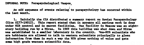 The first “event” raised by the NSA note is a CIA report which mentioned KGB research into parapsychology. According to this, the KGB used hobbyists and non-governmental researchers to talk to western scientists. This allowed the KGB to collect useful information without putting themselves into a position to accidentally leak confidential information to westerners. According to the NSA note, this tactic yielded “high grade western scientific data.”