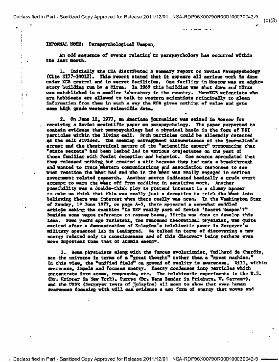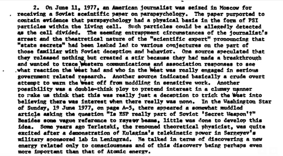 The next event described by the NSA note was what appeared to be a Russian provocation, though exactly what sort, was a matter of some debate. In June 1977, an American journalist was detained in Russia for receiving a Soviet paper on parapsychology. The paper allegedly documented “PSI” (i.e. psychic) particles within the living cell, allegedly providing a physical basis for parapsychology.