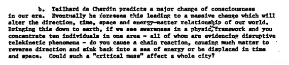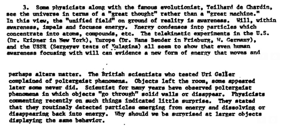 The third event was the apparent postulation by “some physicists along with the famous evolutionist Teilhard de Chardin” that the universe was more of a “great thought” than a “great machine.” According to this view, “the ‘unified field’ on ground of reality is awareness.” The note cited telekinetic experiments and postulated that “awareness focusing” could produce “a new form of energy that moves or perhaps alters matter.”