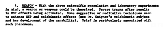 From these premises, two types of telekinetic weapons were hypothesized: a telekinetic time bomb and the equivalent of a psychic nuke that could dislodge a city in time and space.
