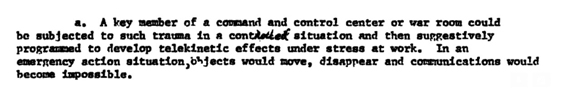 The first involved a member of the command and control staff being kidnapped and subjected to trauma that would allow him to be “suggestively programmed to develop telekinetic effects under stress at work.” The theory was that when an emergency situation arose and the officer was subjected to stress, objects would begin to move and disappear independently “and communications would become impossible.”