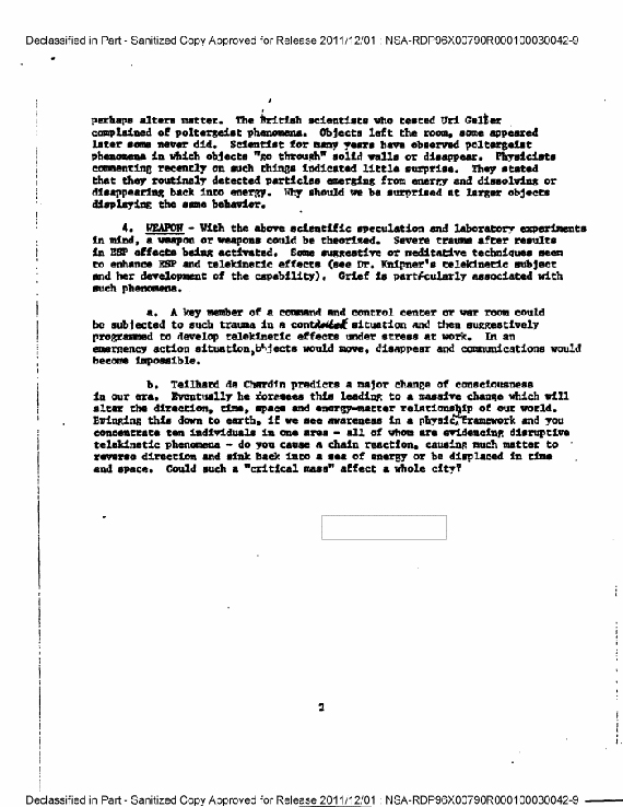 The second hypothetical weapon was even more elaborate and potentially terrifying. Citing a prediction of “a massive change which will alter the direction, time, space and energy-matter relationship of our world,” the note wondered what would happen if a group of psychics were brought together. If ten people who were “evidencing disruptive telekinetic phenomena” were brought into one area, would it “cause a chain reaction, causing much matter to reverse direction and sink back into a sea of energy or be displaced in time and space”? The memo concluded by wondering if such an event reach a “critical mass” and affect an entire city.
