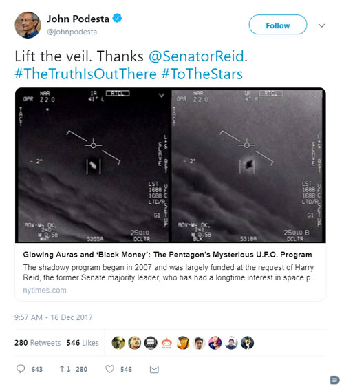 Elizondo now serves on the board at former Blink-182 frontman Tom DeLonge’s To the Stars Academy of Arts and Sciences. To The Stars Academy is the very same organization that would be plugged by none other than Hillary Clinton’s former campaign manager… John Podesta.