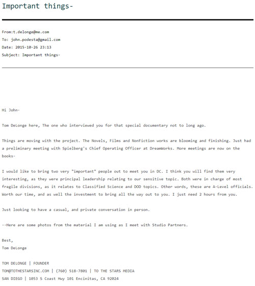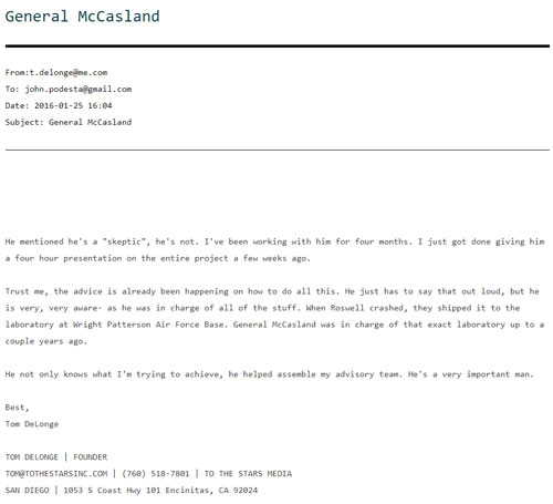 In fact, DeLonge would have some e-mails he sent to Podesta get leaked in the Wikileaks Podesta dump: