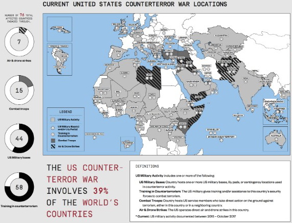 The Costs of War Project has produced not just a map of the war on terror, 2015-2017, but the first map of its kind ever. It offers an astounding vision of Washington’s counterterror wars across the globe: their spread, the deployment of U.S. forces, the expanding missions to train foreign counterterror forces, the American bases that make them possible, the drone and other air strikes that are essential to them, and the U.S. combat troops helping to fight them. (Terror groups have, of course, morphed and expanded riotously as part and parcel of the same process.)