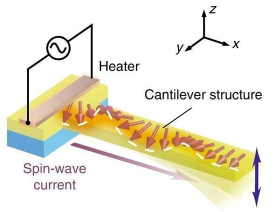In this study, the researchers fabricated a micro cantilever structure made of magnetic insulator yttrium iron garnet (YIG: Y3Fe5O12). A metallic thin wire was put on the root of the cantilever as a heater. When electrical current flows in the wire, the wire works as a generator of spin current by spin Seebeck effect and the spin current propagates into the micro cantilever. The researchers measured the vibration of the cantilever while injecting the spin current modulated near the resonant frequency of the micro cantilever. The measurement confirmed that only when the spin current injection of appropriate spin orientation can excite the vibration of the cantilever.