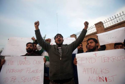 Christians in Pakistan hold placards to condemn the Quetta Church attack during a protest in Peshawar, Pakistan – December 17, 2017.
