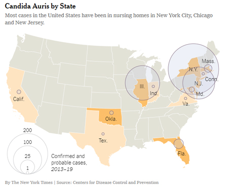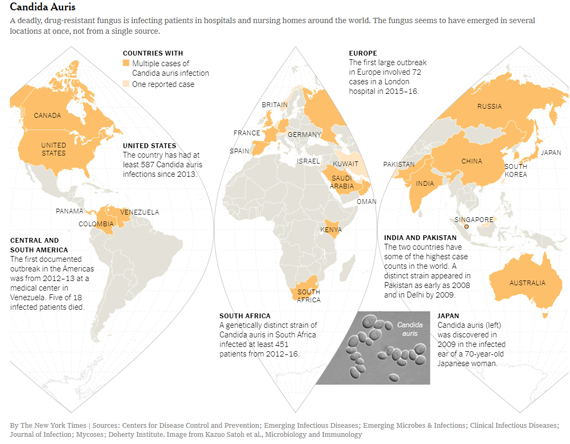 “The earliest known case in the United States involved a woman who arrived at a New York hospital on May 6, 2013, seeking care for respiratory failure. She was 61 and from the United Arab Emirates, and she died a week later, after testing positive for the fungus. At the time, the hospital hadn’t thought much of it, but three years later, it sent the case to the C.D.C. after reading the agency’s June 2016 advisory.” – NYT.
