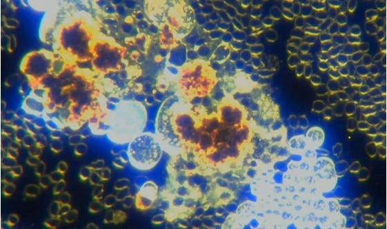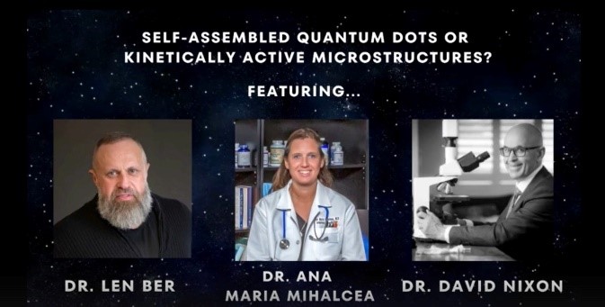 Figure 5. Dr. Mihalcea presented a time-lapsed video of a blood sample showing spheres containing multi-colored nano-sized quantum dots. The spheres continued to grow and reproduce, even though the blood sample came from someone who had died eight months previously. [See video, 1:19:57]