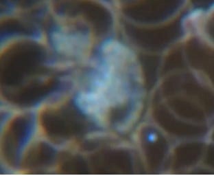 Figure 1. Dr. David Nixon presented this microscopic image of a rapidly moving, nano-sized, multi-colored dot amidst red blood cells that showed an unhealthy Rouleax formation. The dot seemed to be directing the movement of the white blood cell in the center. [See video, 22:58]