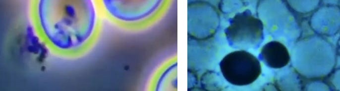 Figures 2 and 3. Dr. Len Ber showed a swarm of black micro-robots pressing against the wall of a red blood cell (left). These blood cells eventually turn empty (right). “The glow of these cells indicates their ability to maintain homeostasis,” he said. The image is of unvaccinated blood combined with the dental anesthetic Carbocaine. [See video, 46:57 and 50:11]