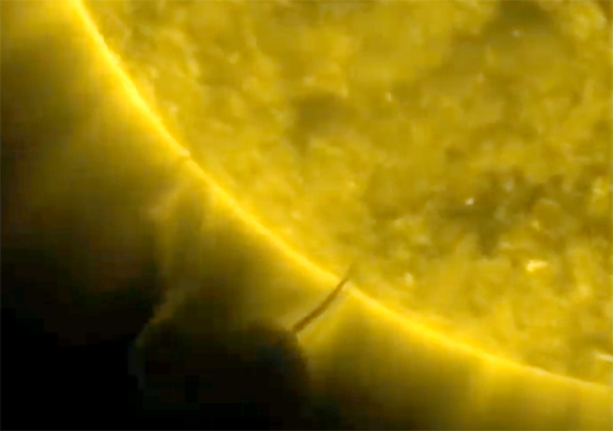 In addition to focusing on the Moon, there are videos of strange orb-like objects which seem to be harnessing the power of the Sun. We see video taken by the Solar Dynamics Observatory. Instead of a typical solar flare, we see a dark object hovering over the Sun with a long dark pipe-like trail leading into the surface of the corona. Then it quickly moves away abruptly.