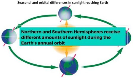 Notice on the upward slopping blue bar line of the Keeling curve in figure 2, the jagged “sawtooth” line. This jagged sawtooth waveform represents the seasonal variations of CO2 as affected by plant growth on land and sea. This is a function of the Earth’s elliptical orbit around the Sun and its 23.5 degree axial tilt.