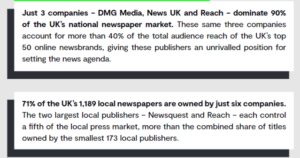 The MRC which has been fighting for a “democratic and accountable media since 2011” wrote that the “UK’s media industries faced significant challenges due to covid,” but they found that “the relative ‘return to normal’ in public life has not halted or reversed the ongoing collapse in media plurality, news diversity and public interest journalism exposed by the pandemic.” Since their last report, the MRC say that large companies have continued to expand their dominant market positions through mergers and takeovers.