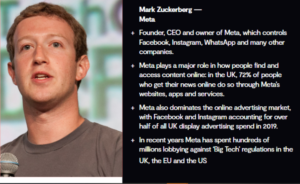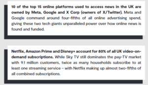 Surrounding and intensifying this crisis in UK media ownership are powerful and unaccountable global tech giants that own huge swathes of the spaces and technologies we use to fund, find and access media content online. As we detail in an expanded section on online intermediaries, Alphabet (owners of Google and YouTube) and Meta (owners of Facebook, Instagram and WhatsApp) hold almost monolithic control over online advertising, user data, content distribution, and news curation – amounting to an unprecedented concentration of ownership in the online media supply chain.