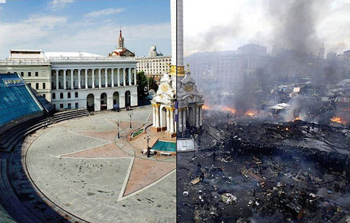 The NGOs of arch-manipulator George Soros played a big part in the 2014 Ukrainian coup. Above: the Maidan in Ukraine, before and after.