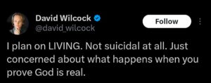 Except everything screams otherwise. Adding explosive fuel to the fire is a now-viral post from Wilcock himself, in which he declared in no uncertain terms: “I plan on LIVING. Not suicidal at all. Just concerned about what happens when you prove God is real.”