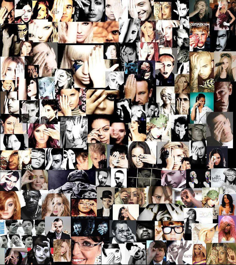 There are so many instances of actors, musicians and pop stars being photographed with one eye covered that it defies the definition of coincidence. Here is a collage with just a tiny fraction of available examples.