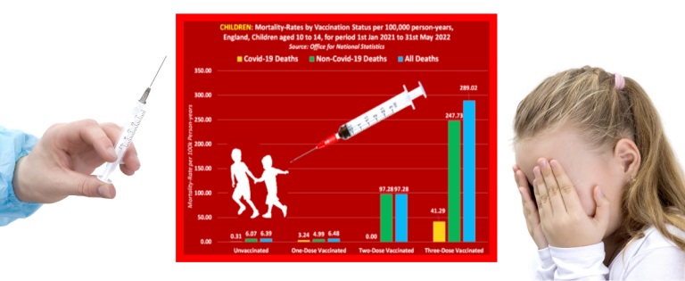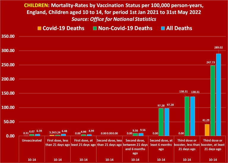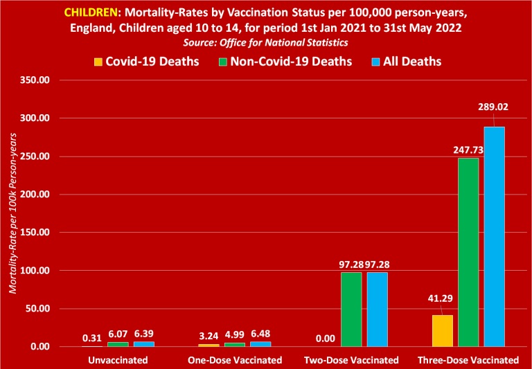 In regard to covid-19 deaths, the ONS reveals that the mortality rate among unvaccinated children aged 10 to 14 equates to 0.31. But in regards to one-dose vaccinated children the mortality rate equates to 3.24 per 100,000 person-years, and in regards to triple vaccinated children the mortality rate equates to a shocking 41.29 per 100,000 person-years.