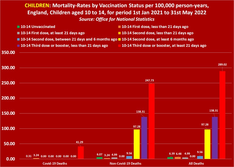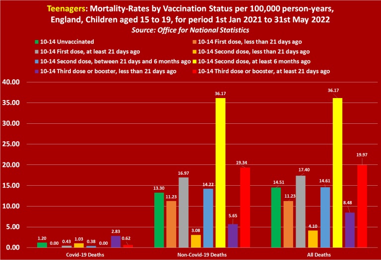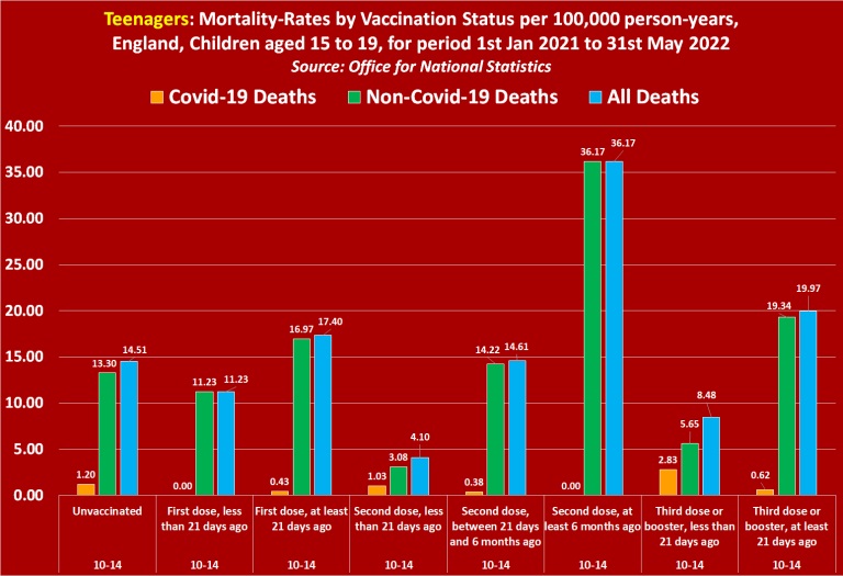 To summarise, the official UK Government figures published by the UK’s Office for National Statistics, prove that covid-vaccinated children and teenagers are more likely to die of both covid-19 and any other cause than unvaccinated children and teenagers.