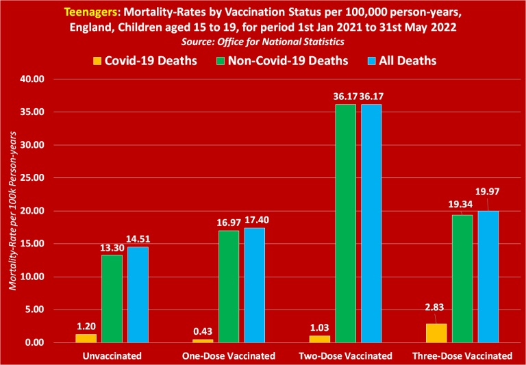 The worst figures in terms of all-cause deaths are however among double-vaccinated teenagers. Official UK Government data reveals that double vaccinated teenagers, with a mortality rate of 36.17 per 100,000 person-years, are 149.3% / 2.5 x more likely to die of any cause than unvaccinated teenagers with a mortality rate of 14.51 per 100,000 person-years.