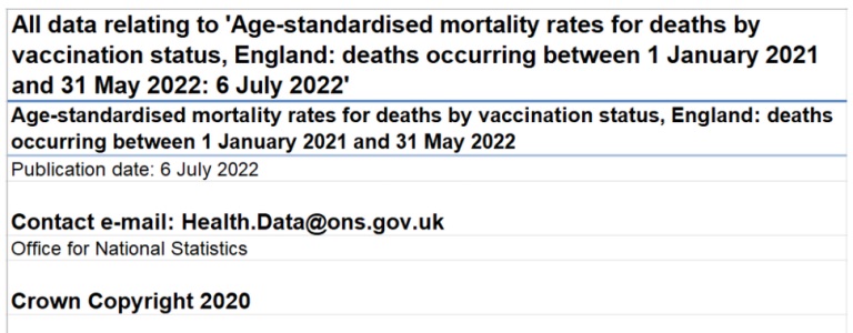 The dataset from the ONS is titled ‘Deaths by Vaccination Status, England, 1 January 2021 to 31 May 2022‘, and it can be accessed on the ONS site here, and downloaded here.