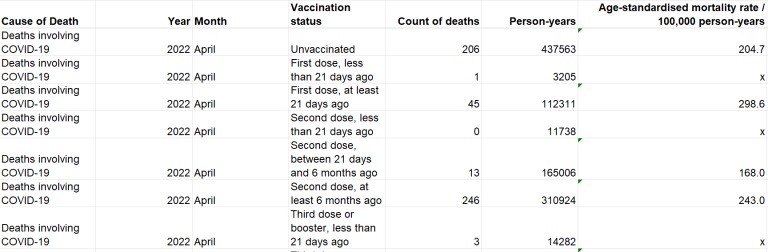 For example, here’s a snapshot of the data from table 1 of the dataset showing the death rate per 100,000 person-years by vaccination status in April 2022.
