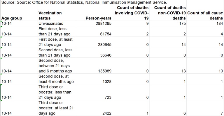 Here’s a snapshot of the ONS data on deaths among children aged 10 to 14 between 1st Jan 2021 and 31st May 2022 by vaccination status.