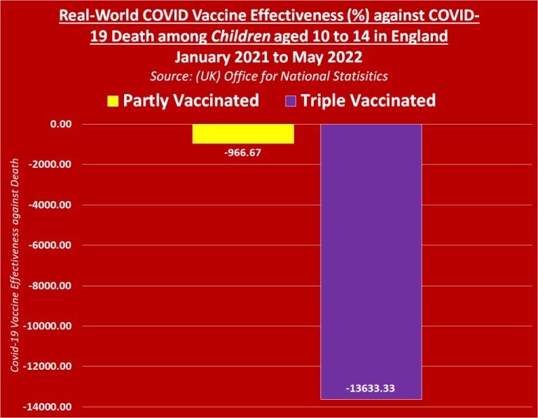 The covid-19 injections are proving to have real-world negative effectiveness against death of minus -966.67% among partly vaccinated children, and a shocking real-world negative effectiveness against death of minus -13,633.33% among triple vaccinated children.