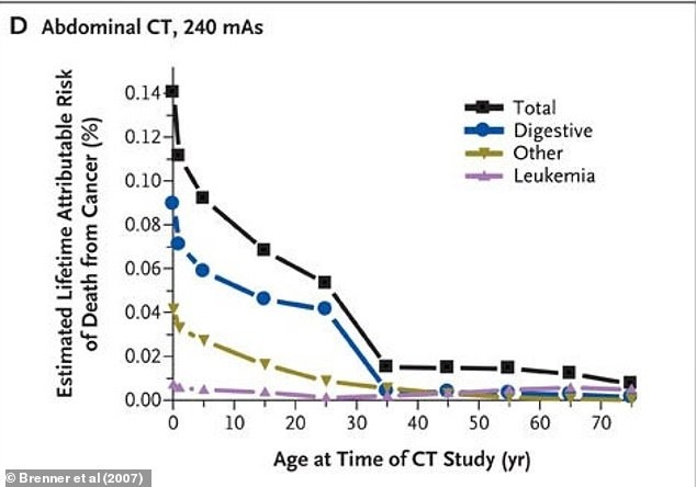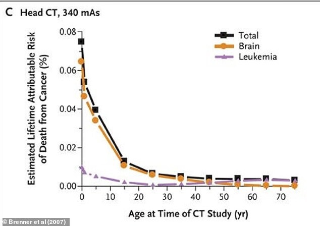 The above shows the estimated percent lifetime risk of death from cancer that is attributable to the radiation from a single CT scan of the head.