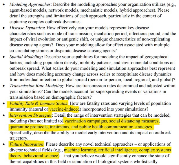 Moving on, the RFI gets into modelling lockdowns, social distancing, and mass vaccination campaigns, along with communication strategies: