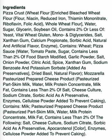 “Purified Drinking Water; Pizza Sauce (Water, Tomato Paste, Sugar, Contains Less than 2% of Modified Food Starch, Garlic Powder, Salt, Onion Powder, Spice, Citric Acid, Dried Basil, Sea Salt, Sodium Benzoate and Potassium Sorbate [Added as Preservatives], Xanthan Gum, Natural Flavor)