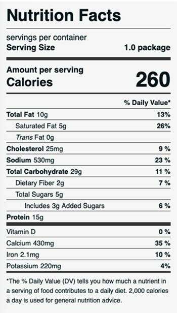 The school lunch program version comes in a 5.05-ounce container and is formulated to contain 2 ounces of meat/meat alternative, 2 ounces of grains, one-eighth cup of red vegetable (tomato sauce), 7 grams of saturated fat and 700 milligrams of sodium.