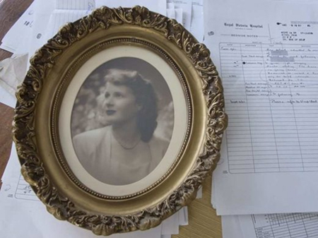 A photograph of Jean Steel lies on the table next to the bedside notes, hospital notes from her treatment for depression, seen in her daughter’s home in Quebec