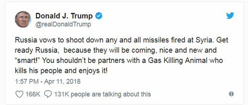 On Wednesday, April 11, President Donald Trump ramped up tensions over Syria by tweeting: “Russia vows to shoot down any and all missiles fired at Syria. Get ready Russia, because they will be coming, nice and new and ‘smart’! You shouldn’t be partners with a Gas Killing Animal who kills his people and enjoys it!”